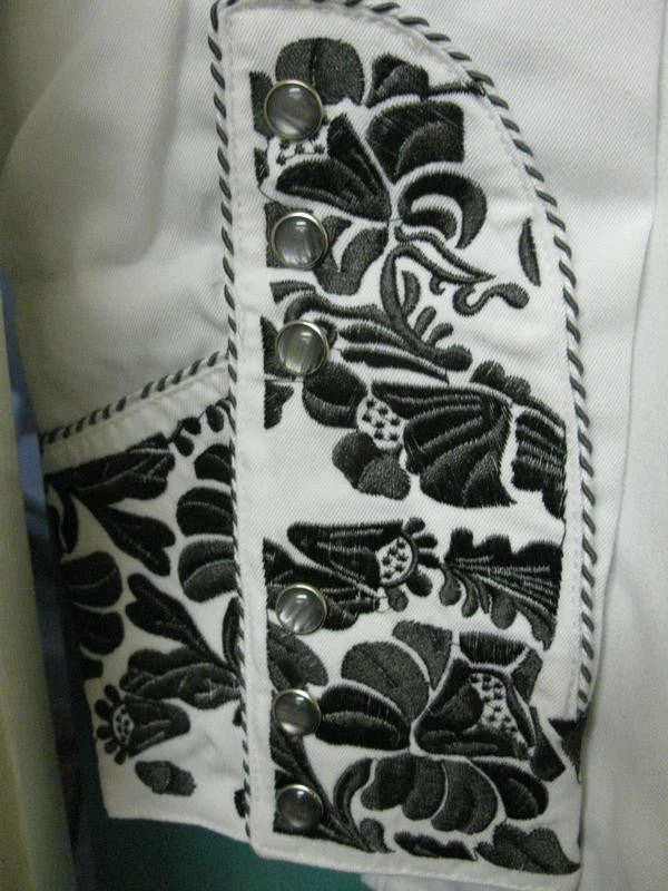 - White body with elegant pewter floral embroidered yokes and cuffs