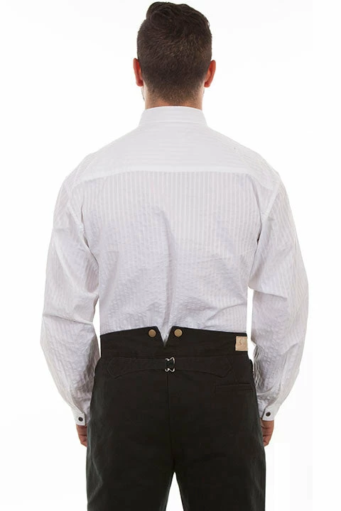 This stylish stripe shirt is perfect for work or play. Features a full button front, band collar and left chest pocket. 100% cotton.