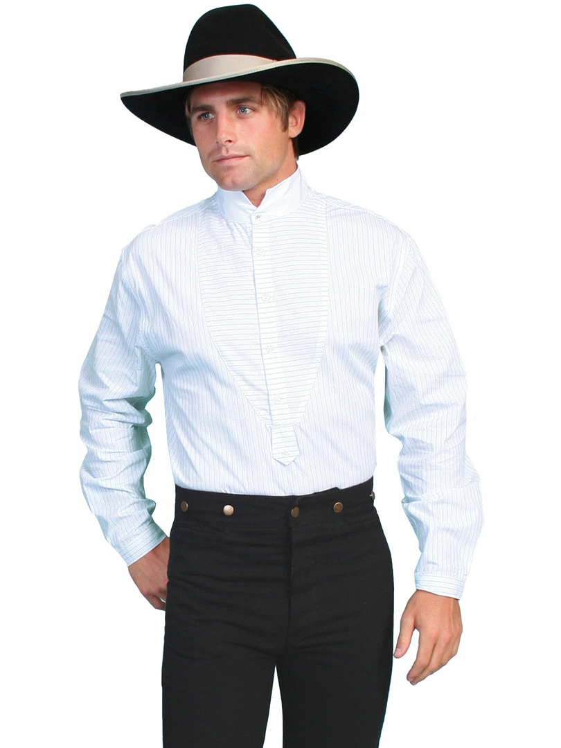This stunning stripe shirt is the perfect shirt for special and formal occasions. It features an inset bib front, stand-up collar and is sheared at the back yoke for extra room and comfort. 100% cotton.