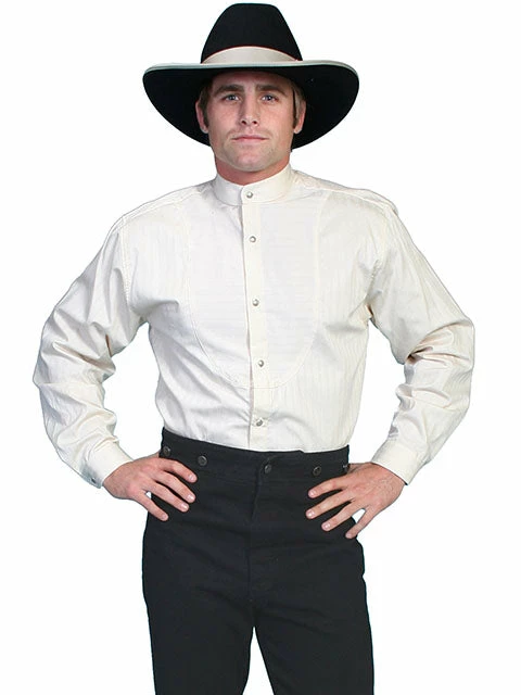 This classic style features an inset bib with stamped metal buttons with a beautiful tone- on-tone stripe design. It has a banded collar and double pleat at the center back. 100% cotton.