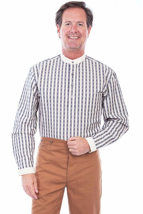 Here’s a great looking blue stripe shirt that will add a dash of the West to any wardrobe! This stylish striped shirt is perfect for work or play. It features a four button front, pullover style and contrasting collar and cuffs. Features: