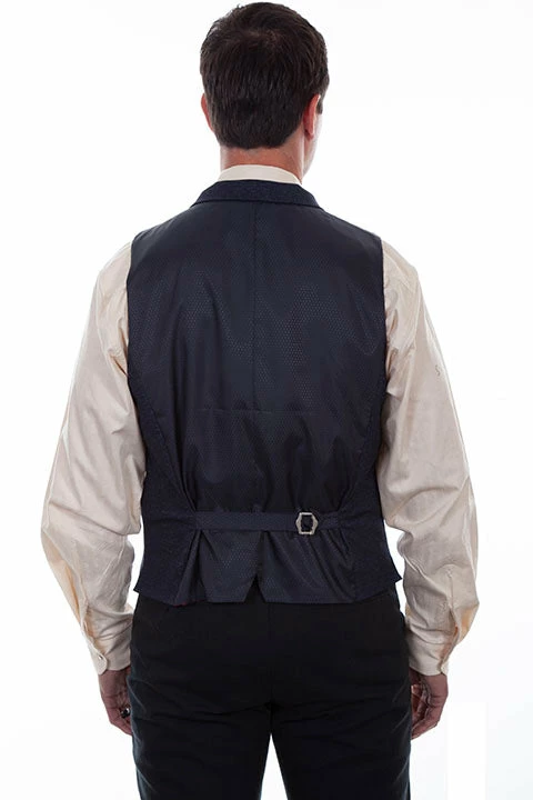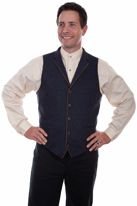 Solid four pocket vest inspired by styles worn by businessmen a century ago. Refashioned and given new life. Notice the watch pocket indicative of those times. Features small notched lapels, five button front closure, chest welt pocket, two self piping lower pockets and a watch pocket. Contrast piping down the front.