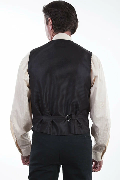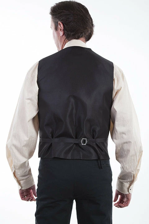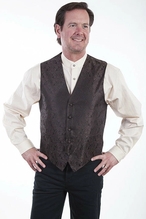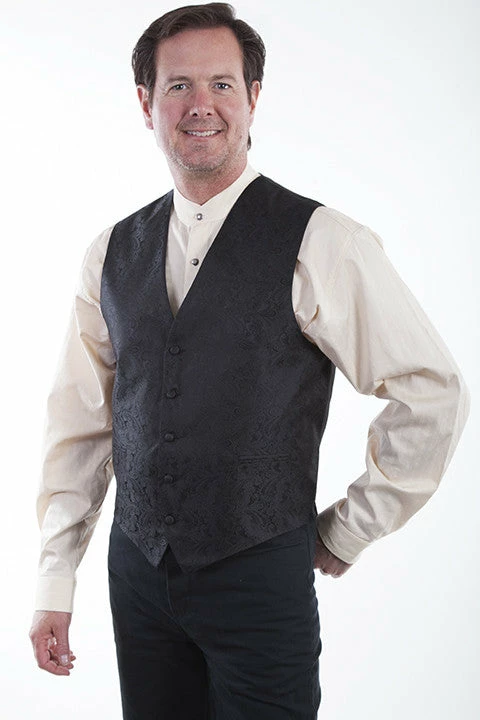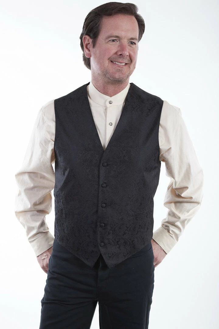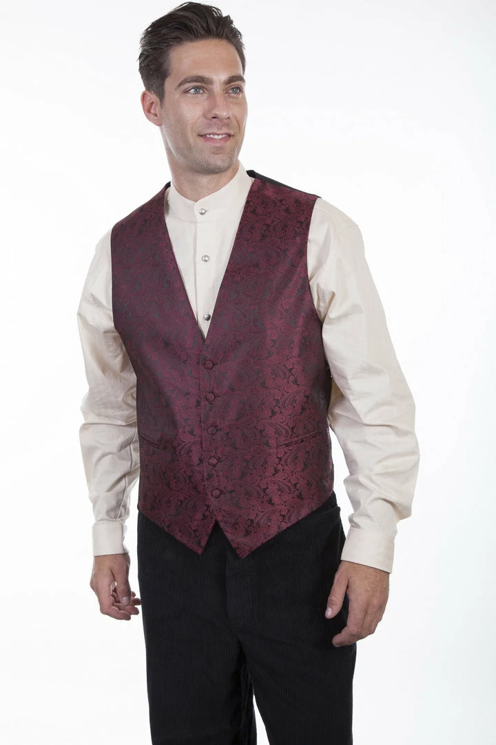 Classic paisley vest with plain front, no lapels. Ideal for so many occasions! Covered button front and two welt pockets for your watch and chain. Adjustable back strap and is fully lined. 100% polyester.