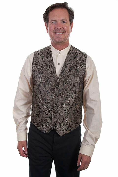 The classic styling and elegant fabric of this vest makes it one of the most popular in the line. The beautiful scrolls and swirls pattern would have been a favorite of gamblers and bankers in the 1880’s as it is today. Features notched lapels, self-covered buttons and two front welt pockets. Fully lined. Adjustable back strap – 100% polyester.