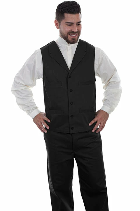 Durable cotton vest features five button front closure, notched lapels and four front welt pockets. The back features an adjustable back strap for fit. This herrinngbone vest is unlined. 100% cotton. Made in USA.