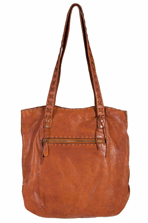 Soft leather handbag features top magnetic snap closure, interior two open pockets and zip pocket. Exterior rear zip pocket. Double shoulder straps with cross stitch and extended laces. Exterior seams have a whip stitch trim around the perimeter and a pick stitch across the top of the bag.