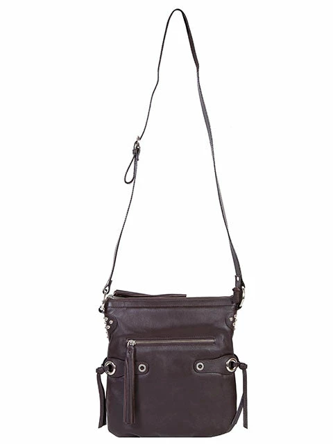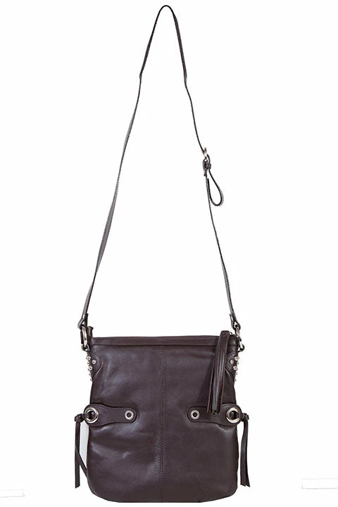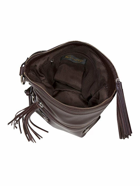 Brown leather handbag with side tassels.