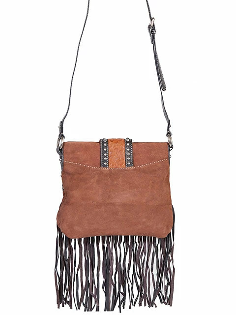 Sumptuous soft brown suede contrasted with black leather trim and fringe is a “must have” crossbody bag.