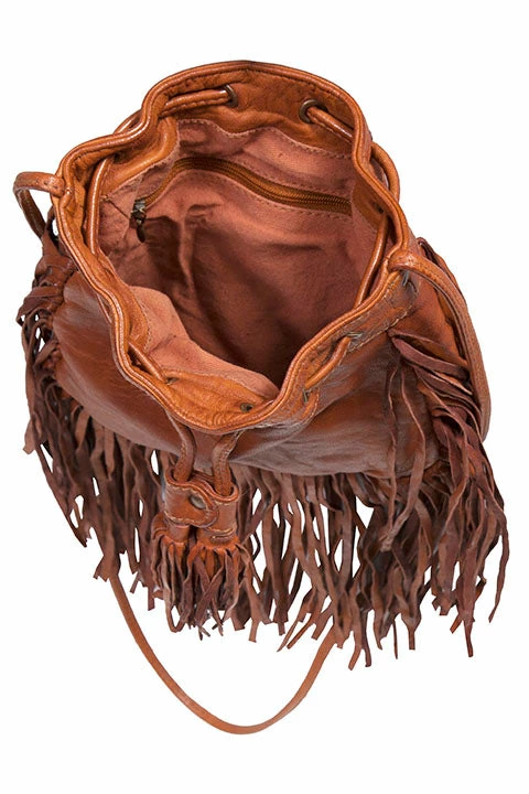 Soft leather handbag features a top cinch tie closure with tassel ends - Generous fringe runs along the front and back sides and bottom