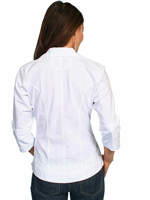From Scully’s Cantina Collection comes this feminine, crisp, white shirt loaded with charming details including: