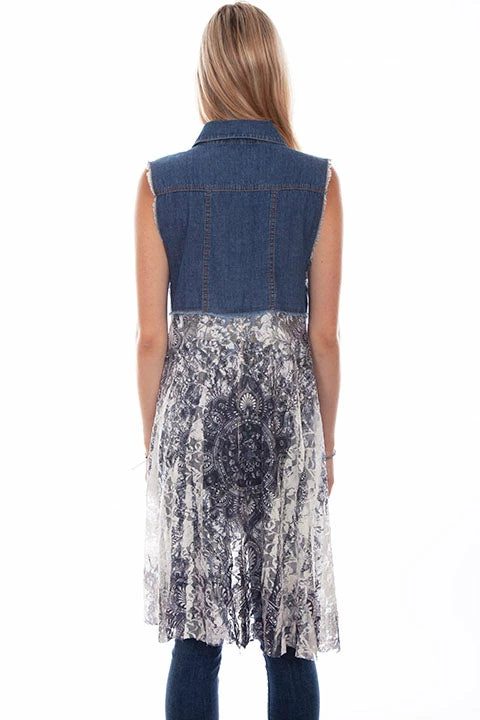 Feminine and flirty. Empire style, sleeveless denim top with printed lace skirt. The top has a three metallic button front, point collar and two chest flap pockets with button closures. Printed lace full skirt.