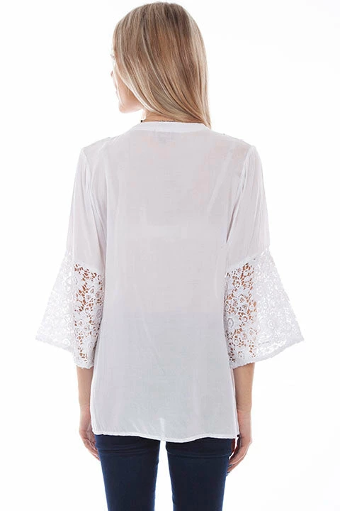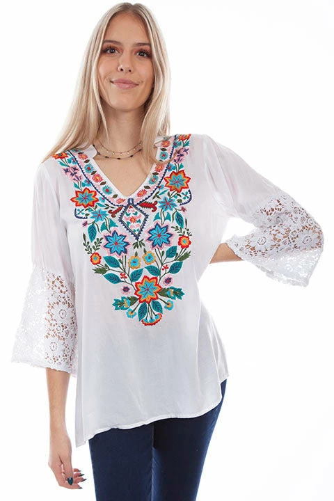 This lightweight, relaxed-fit pullover features floral embroidery around the “v” neck and on the tunic’s front. The sleeves have a floral crochet design starting on the upper sleeves.