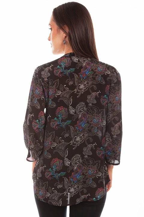Truly a variation on a theme, this paisley print is a stand out. It features a button front closure, stand-up collar with a keyhole opening, shirt tail hem and 3/4 sleeves.