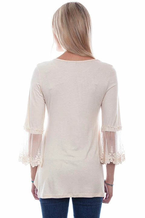 This beautiful style has an easy-fit and is just right for any occasion. This is a solid top with tulle crochet sleeves and handkerchief hemline.