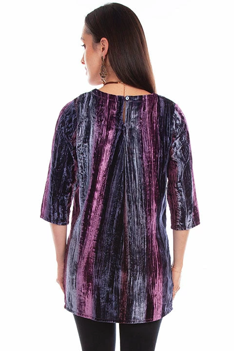 This fashionable velvet tunic is the one to add to your wardrobe. Pullover with round neck. slit sides. longer in back, and 3/4 sleeves.