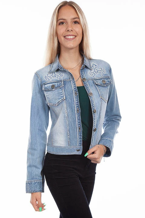 These inspiring beaded patterns will lift your spirits to new heights! This classic jean jacket features beading on front and back, metallic button front closure, point collar and two flap chest pockets with button closures.