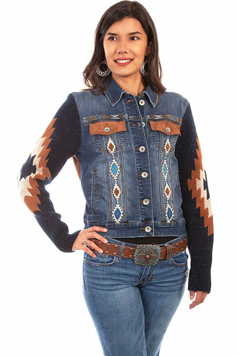 Faded beat-back denim jacket ups the ante with an Aztec embroidered front and back and sweater sleeves with a woven Aztec pattern. Features a button front, two flap chest pockets with button closures and point collar.