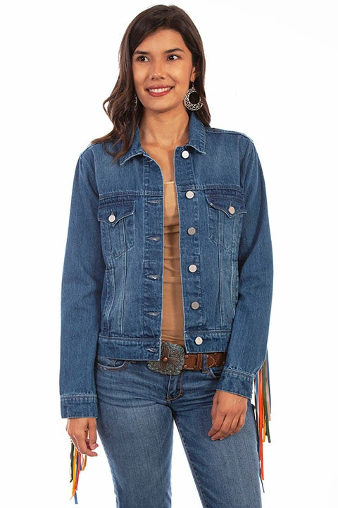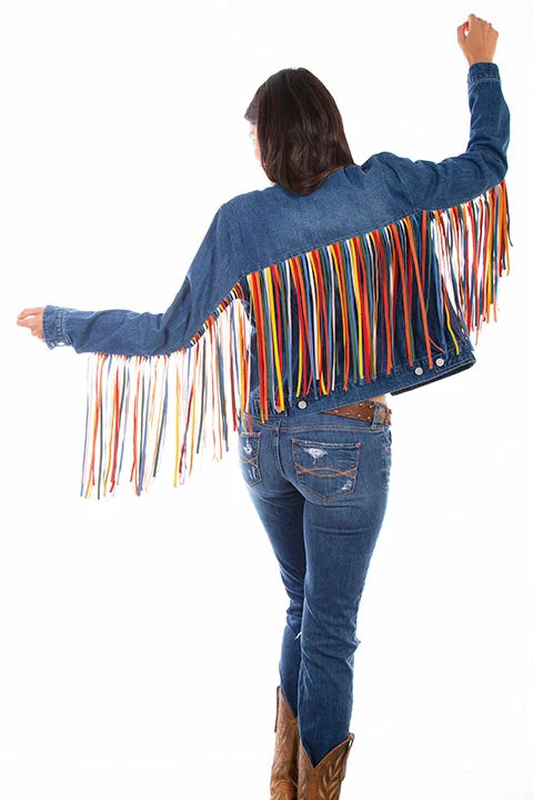 Live on the FRINGE! This traditional jean jacket takes on a new vib with it’s colorful serape long fringe.It features a button front, two chest flap pockets and two lower vertical side entry pockets.The fringe is placed across the back and down the sleeves