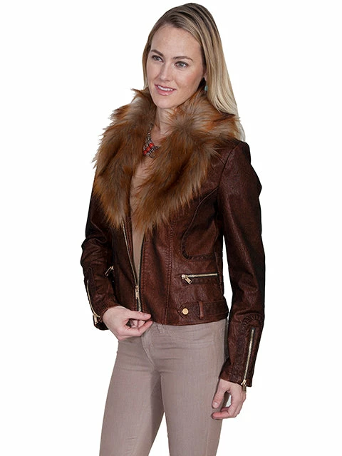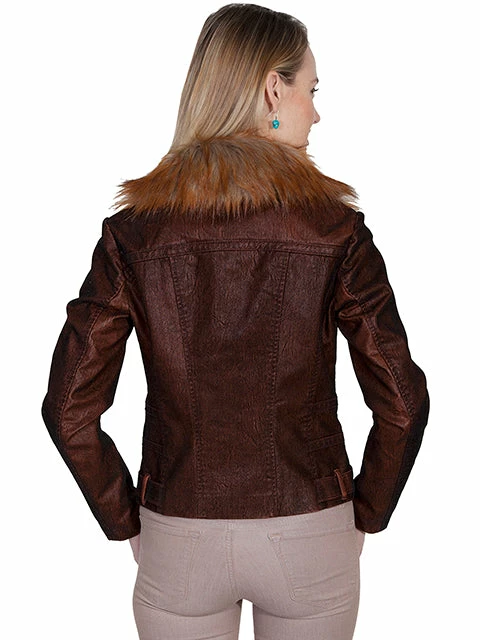 Stunning jacket features a faux fur collar and faux leather body. Notched lapels with zip front closure, two lower zip pockets and two waist straps with snap closures.