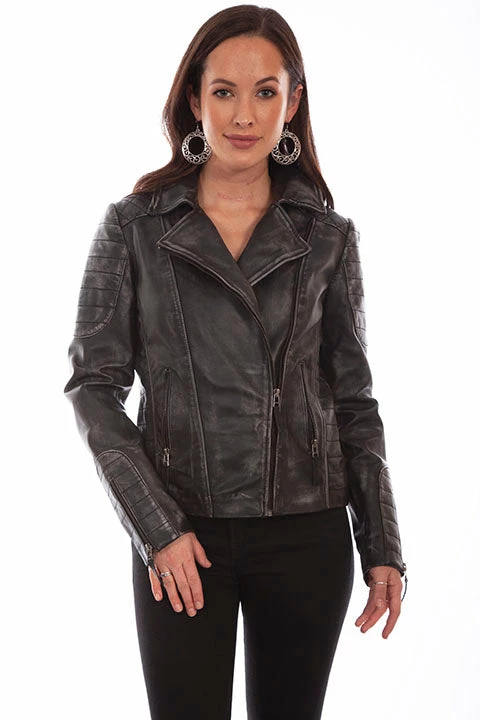 This exquisitely tailored motorcycle jacket features ribbed stitched side panels and rib stitched upper sleeve and cuff patches. The shoulders are detailed in a quilted stitch pattern. It has an asymmetrical zip front closure with two vertical zip pockets and zip cuffs. Black or Brown. Lined. Import.