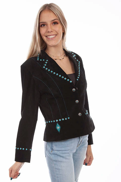 This elegant and flirty blazer features a three button front closure with two lower open pockets. The perky turquoise studs are on the notched lapels, cuff trim, pocket trim with a diamond design. The back features a lower turquoise two row design with a diamond center.