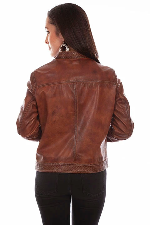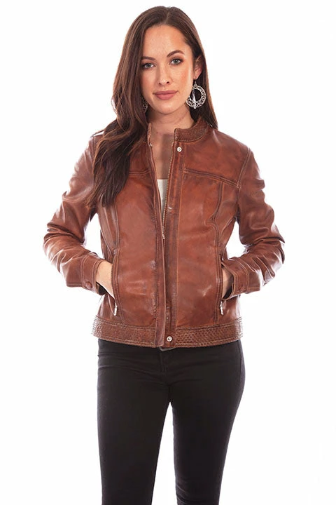 This flattering slim-fit jacket features a zip front closure and checker board weave band collar and waistband. It has two lower vertical zip pockets. The interior flaunts a 100% lively cotton print lining. Import.
