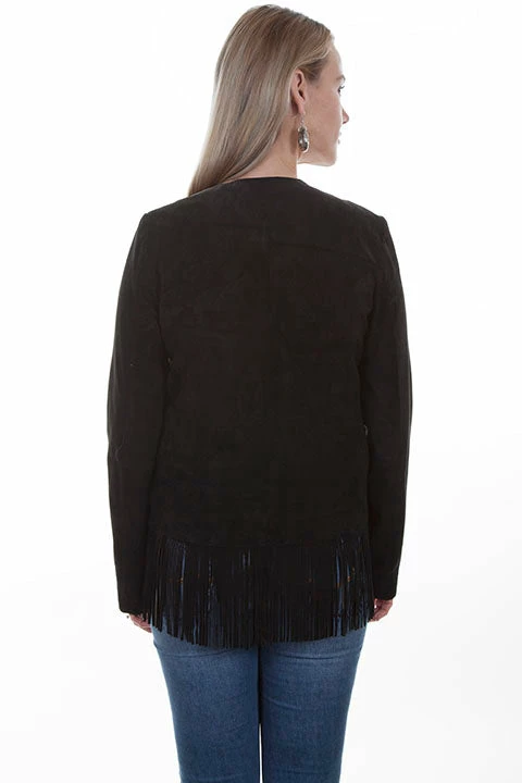 A fashionable alternative to the classic blazer, this will get attention every time! This fringe jacket is made of a rich soft boar suede featuring an abundance of fringe starting from the collar, down the front and all around the hem. Two lower diagonal pockets. Hook and eye closure. Fully lined.