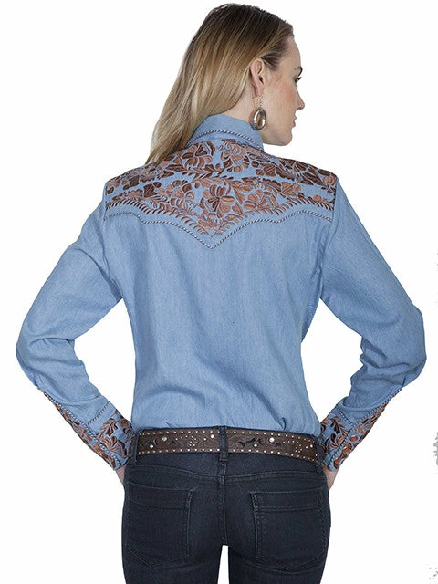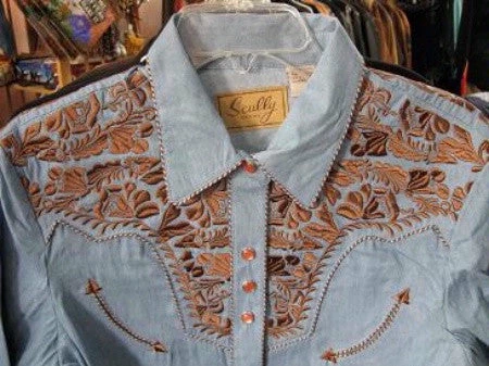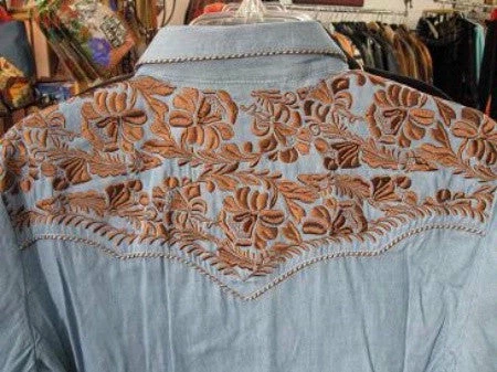 If you are a fan of Scully’s shirts, this one will be familiar to you as it is one of their most popular styles and is offered in a variety of color combinations. Casual color combination of light blue denim body and elegant rust embroidered yokes and cuffs.