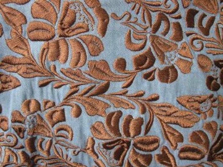 - Blue denim body with elegant rust floral embroidered yokes and cuffs