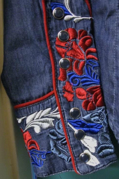 - Deep blue denim body with multi color floral embroidered yokes and cuffs
