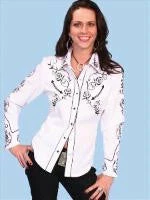 - White body with elegant black roses and vines embroidery on front, back, sleeves