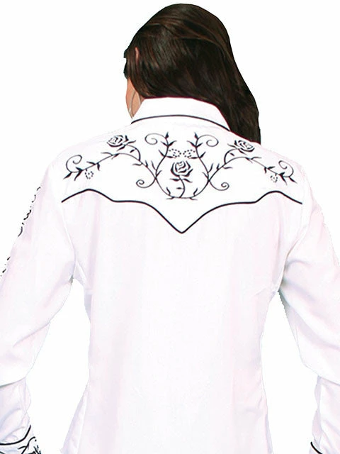 This shirt is so pretty – the White is refreshing to the eye and the Black Roses add a touch of sophistication. Roses adorn the front, collar tips, cuffs, back yoke, and…my favorite element…down the sleeves. Knock-out design.