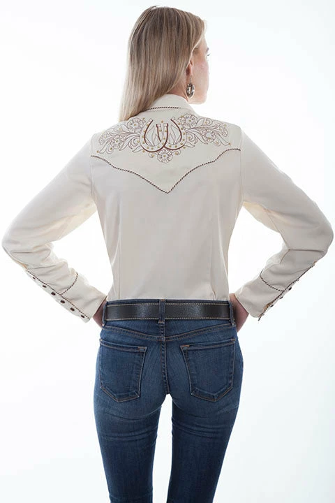 Pretty embroidered blouse, Western style, features embroidery on front and back yokes. Candy cane piping throughout