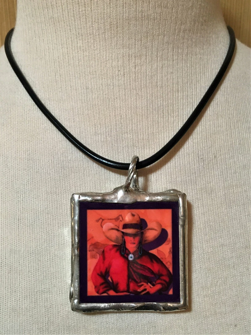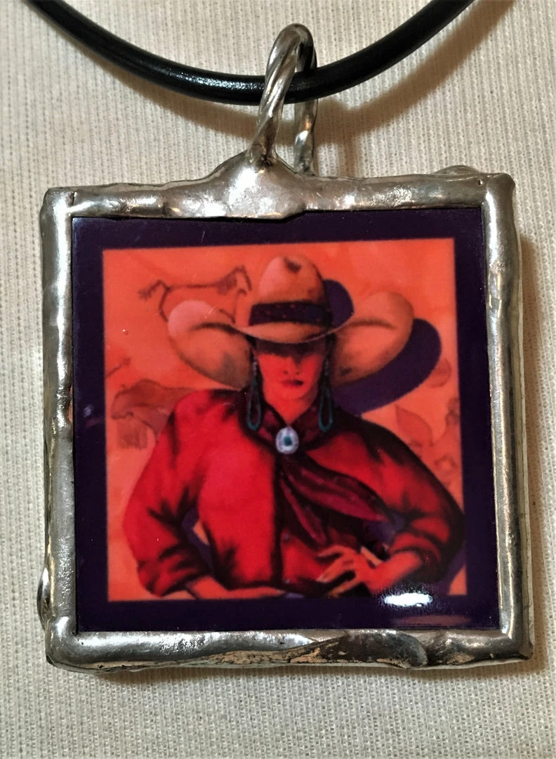 2″ x 2″ Ceramic Pendant is bezel set in silver, suspended on 20″ black thong with lobster claw clasp. Classic Cowgirl in shades of red. Bale is wide enough to suspend on beads, chains, cord, ribbon…whatever you fancy!