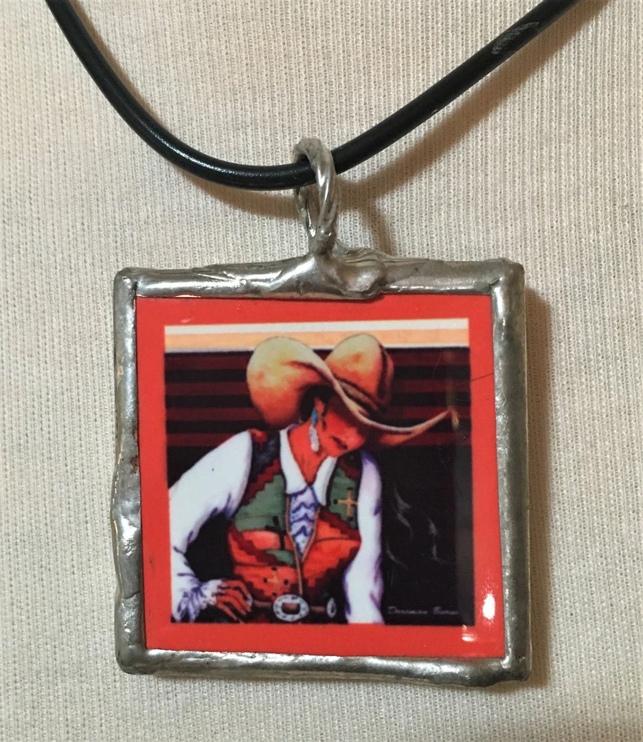 2″ x 2″ Ceramic Pendant is bezel set in silver, suspended on 20″ black thong with lobster claw clasp. Classic Cowgirl in shades of red and green. Bale is wide enough to suspend on beads, chains, cord, ribbon…whatever you fancy!