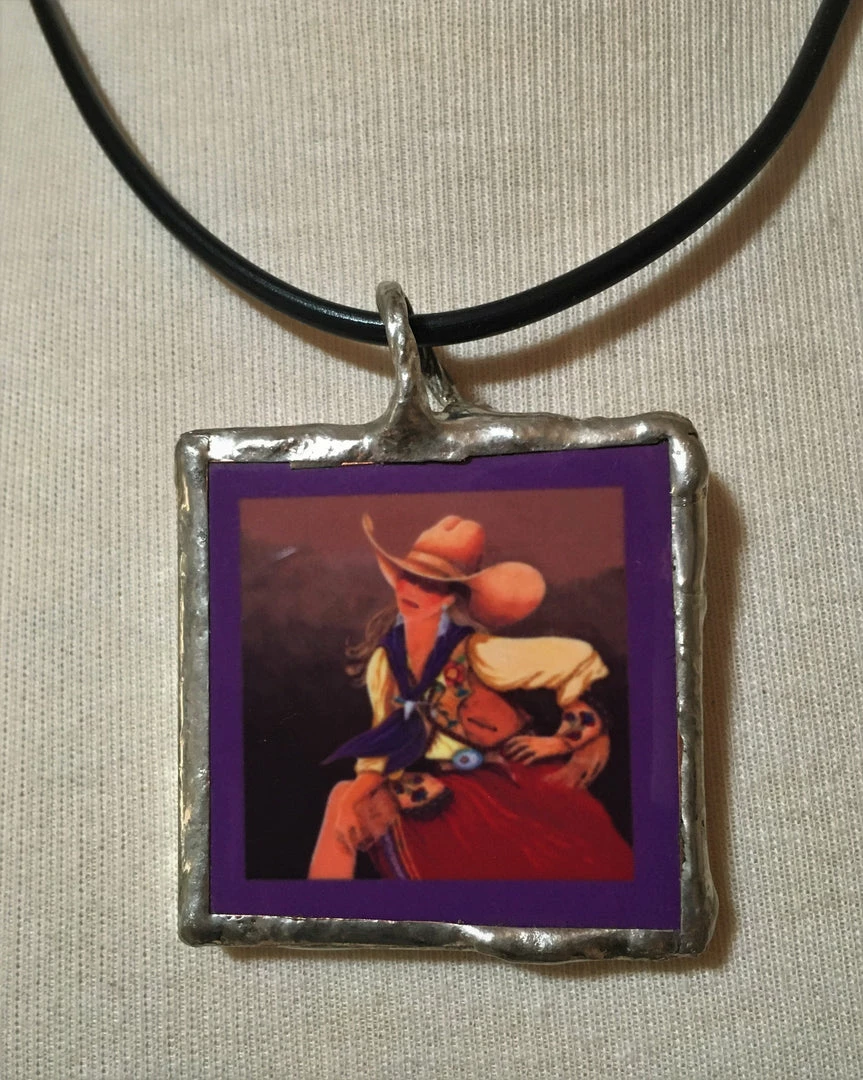 2″ x 2″ Ceramic Pendant is bezel set in silver, suspended on 20″ black thong with lobster claw clasp. Classic Cowgirl in shades of red and purple. Bale is wide enough to suspend on beads, chains, cord, ribbon…whatever you fancy!