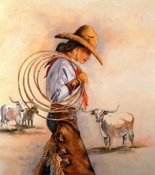 “I try to paint a figure that portrays the strong independent cowgirl spirit, while trying to grasp an accurate reflection of the western cowgirl culture. I stylize, emotionalize, and romanticize my cowgirls.”
