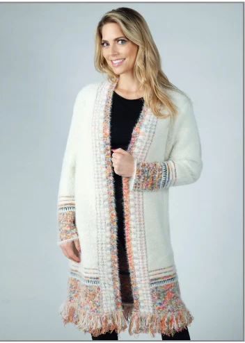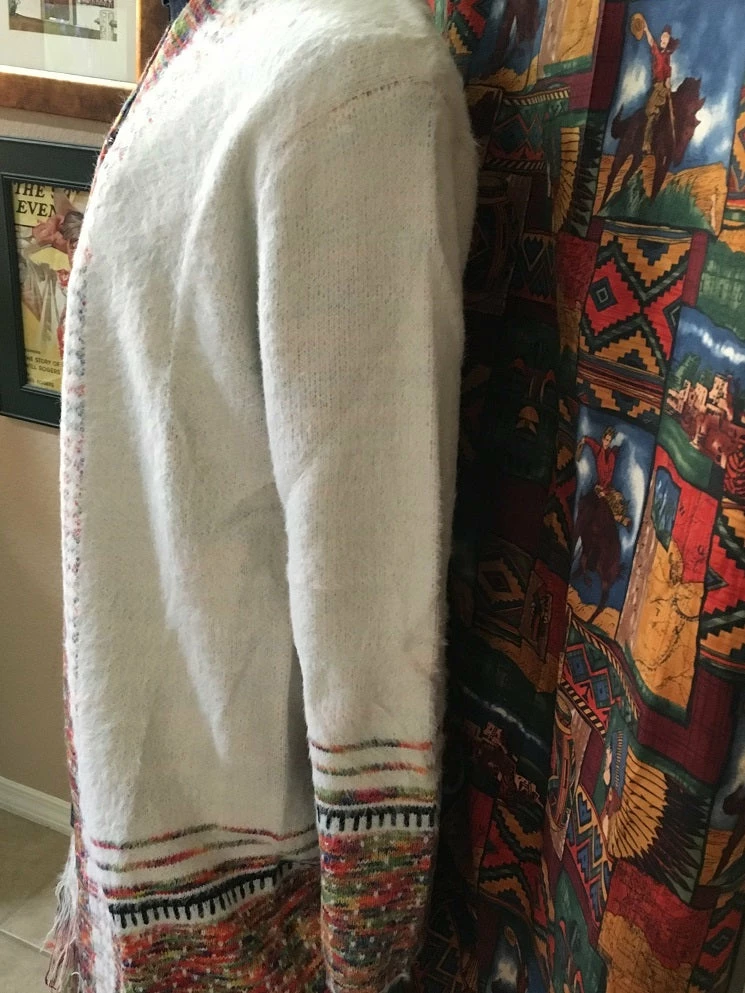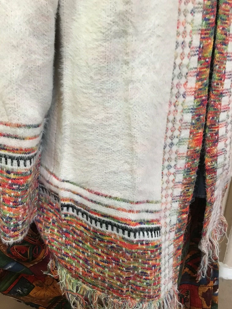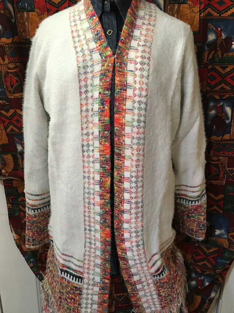 Fresh and Crisp! Ivory cardigan sweater with multi-color pattern down the front, a border around the hemline, and cuffs. Features single hook-and-eye closure, fringe along bottom hem. Car coat length for comfort, warmth, and style.