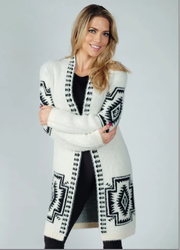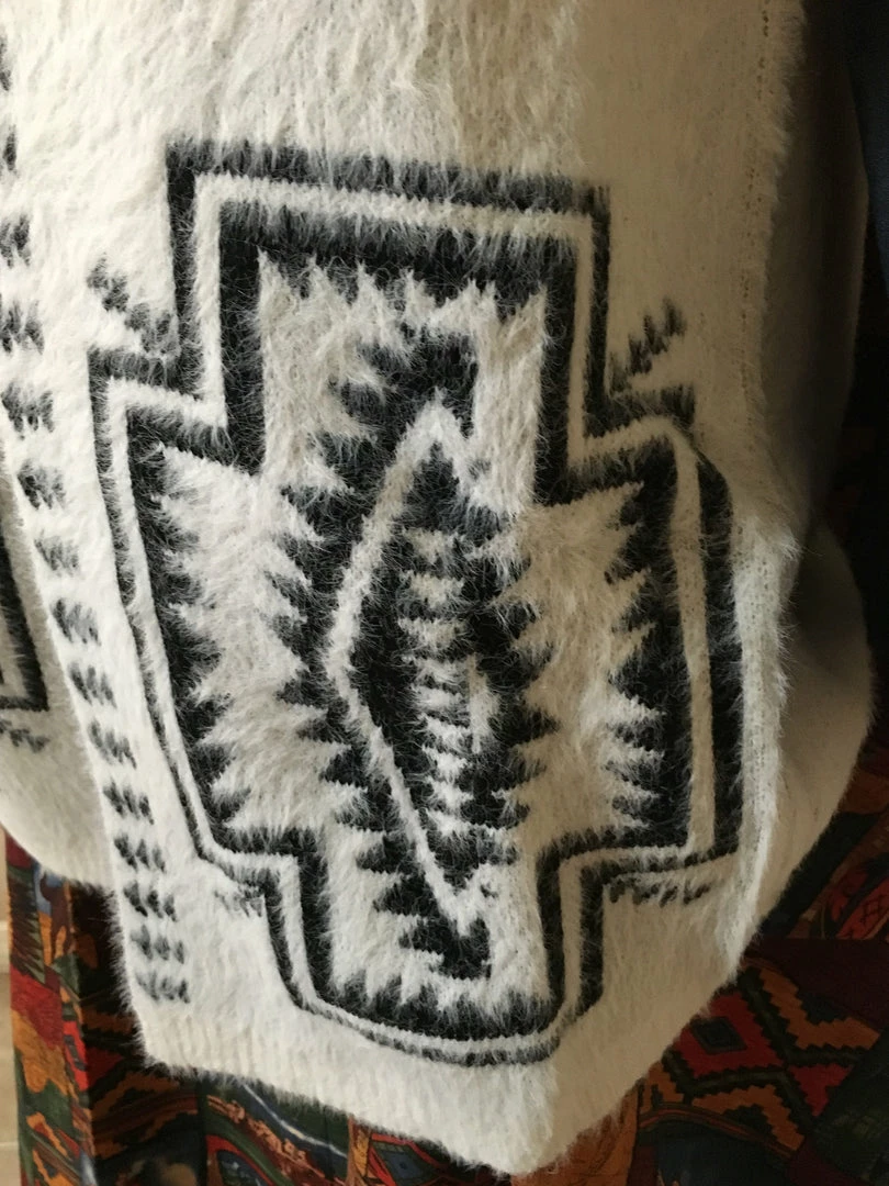 Ivory cardigan sweater with black square Southwest cross on each side of the front, on the sleeves, and on the back. Features single hook-and-eye closure. Car coat length for comfort, warmth, and style.