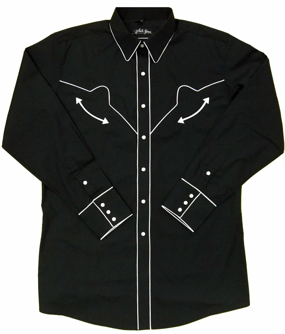 This long sleeve cotton blend Retro Western shirt features classic white piping on black body with black snaps.