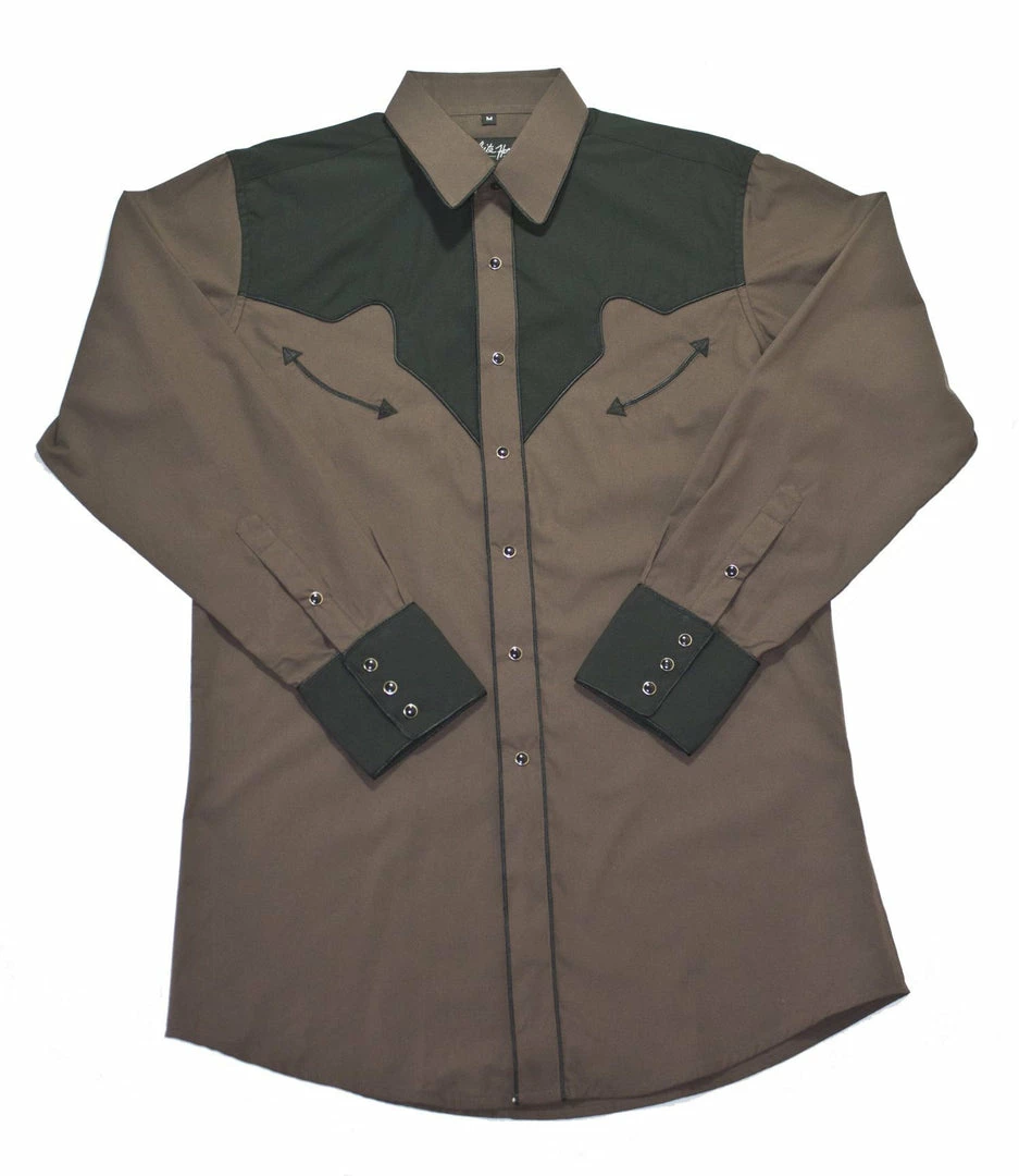 This long sleeve Retro Western shirt features classic black yokes, cuffs and piping, black snaps on chocolate.