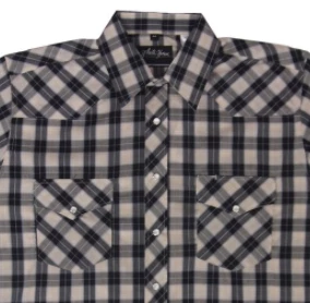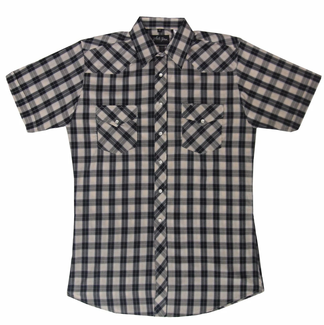 This short sleeve cotton blend black/tan plaid casual Western shirt features: