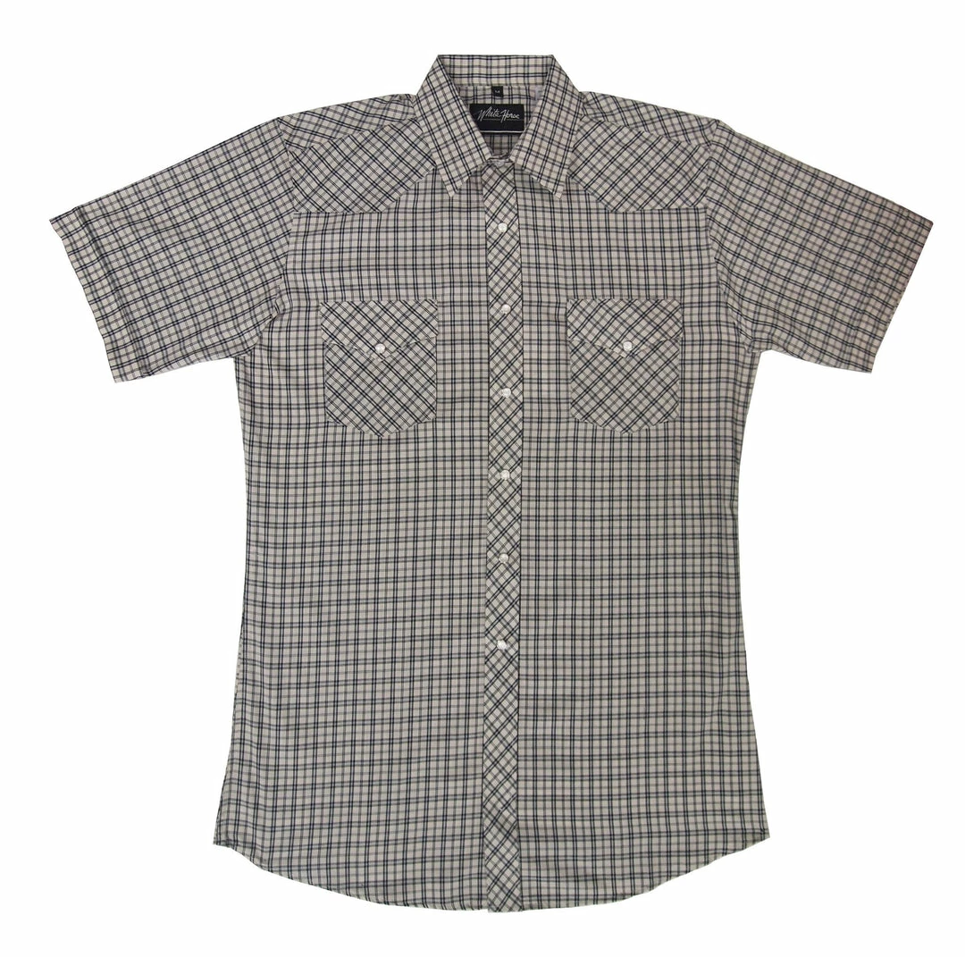 This short sleeve cotton blend black/tan plaid casual Western shirt features: